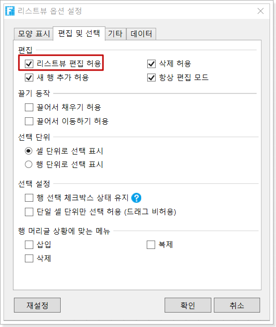 리스트뷰를 선택하고 마우스 오른쪽 버튼을 클릭한 다음 마우스 오른쪽 버튼 클릭 메뉴에서 리스트뷰 옵션설정을 선택하여 리스트뷰 설정 대화 상자를 표시합니다.
