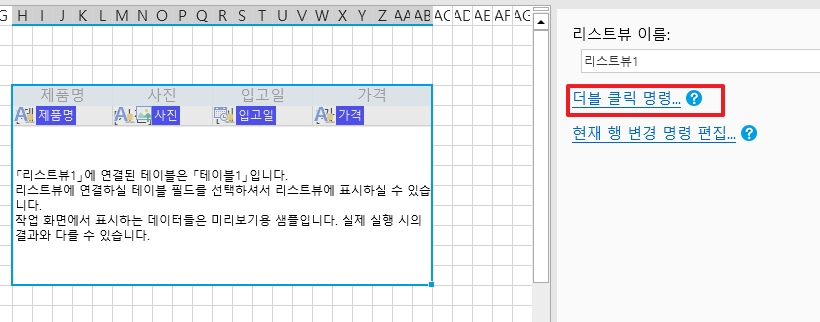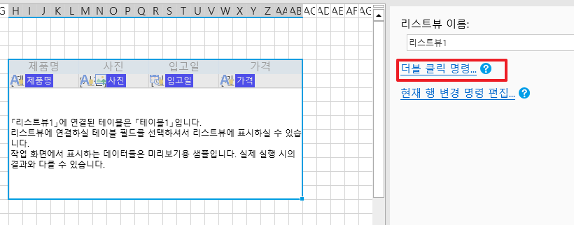 리스트뷰를 선택하고 속성 설정 영역의 셀 설정에서 "두 번 클릭 명령 편집"을 클릭합니다.