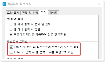 리스트뷰 선택하고 마우스 오른쪽 버튼을 클릭하고 마우스 오른쪽 메뉴에서 [리스트뷰 세부 옵션 설정]을 선택하고 리스트뷰 설정 대화 상자를 표시하고 [기타 동작] 탭에서 포커스 동작을 설정합니다.