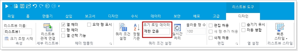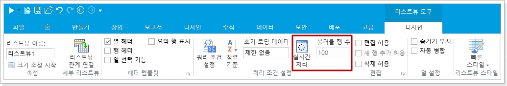 리스트뷰를 선택한 후 리본메뉴에서 [리스트뷰 도구-디자인-쿼리 조건 설정]에서 실시간처리를 클릭하면 로드된 행 수를 설정할 수 있습니다.