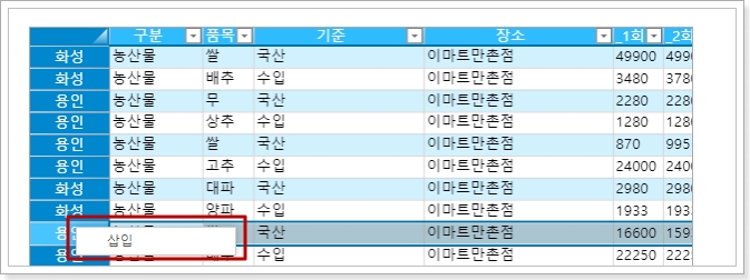 설정이 완료되면 페이지를 실행하고 브라우저에서 리스트뷰의 행 헤더를 마우스 오른쪽 버튼을 클릭하면 마우스 오른쪽 버튼 클릭 메뉴가 나타나고 삽입을 클릭합니다.