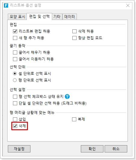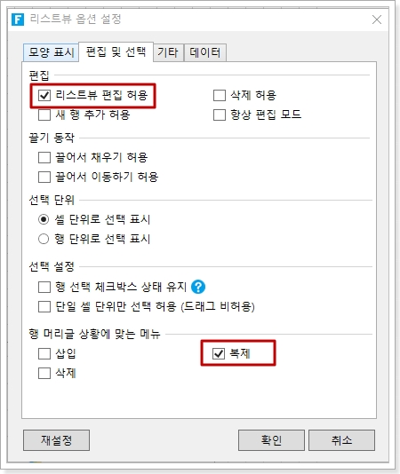 리스트뷰를 선택하고 마우스 오른쪽 버튼을 클릭하고 마우스 오른쪽 버튼 클릭 메뉴에서 [리스트뷰 옵션 설정]을 선택하고 [편집 및 선택] 탭에서 편집 설정에서 [편집] 및 [행 머리글 상황에 맞는 메뉴] 메뉴에서 [복제] 선택합니다.