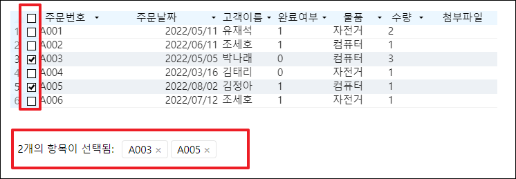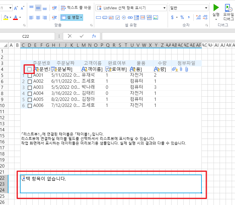 행을선택하려면  리스트뷰에서 레코드 앞의 체크박스를 선택하면 선택한 레코드가 리스트뷰 선택 항목표시기에 표시됩니다.