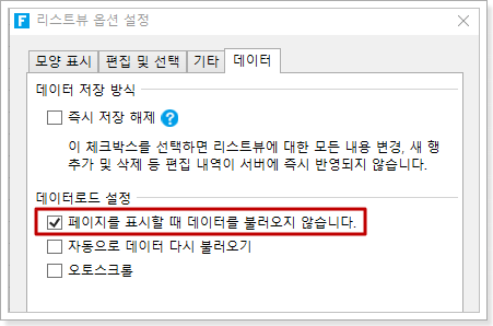 리스트뷰를 선택하고 마우스 오른쪽 버튼 클릭, 오른쪽 클릭 메뉴에서 "리스트뷰 옵션 설정"을 선택, 리스트뷰 설정 대화 상자를 팝업창에서 데이터"탭을 선택하고, "페이지를 표시할 때 데이터를 불러오지 않습니다"를 선택하 페이지를 열 때 테이블 데이터를 로드하지 않습니다, 데이터가 새로 고쳐질 때만 데이터가 로드됩니다.