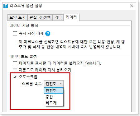 리스트뷰를 선택하고 마우스 오른쪽 버튼 클릭, 오른쪽 클릭 메뉴에서 "리스트뷰 옵션 설정"을 선택, 리스트뷰 설정 대화 상자를 팝업창에서 데이터"탭을 선택하고, [오토스크롤]을 선택하면 자동 스크롤 속도(느린, 중간 및 빠른)를 설정할 수 있습니다.
