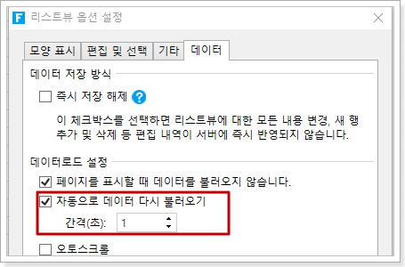 기본적으로 "자동으로 데이터 다시 불러오기 "를 선택되어 있지 않습니다.