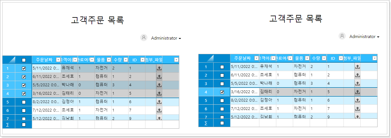다중 선택은 기본적으로 허용됩니다. "단일 셀 단위만 선택 허용"을 선택하면 다중 선택이 단일 선택만 가능합니다.