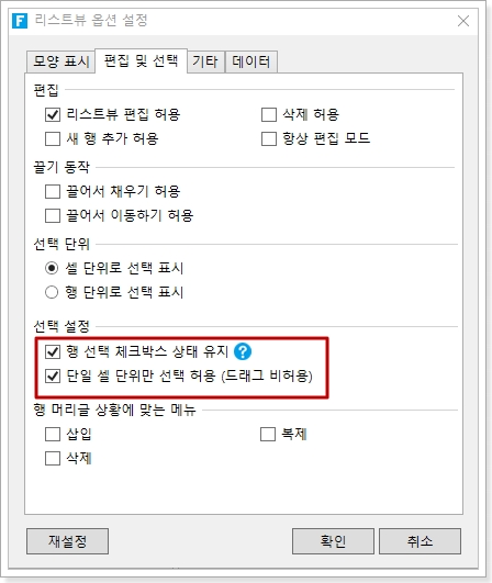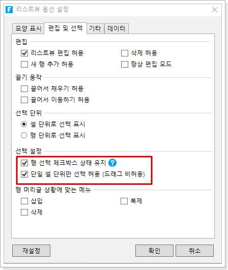 리스트뷰를 선택하고 마우스 오른쪽 버튼을 클릭하여 마우스 오른쪽 버튼 클릭 메뉴에서 [리스트뷰 옵션 설정]을 선택한 후, [편집 및 선택] 탭을 선택합니다.