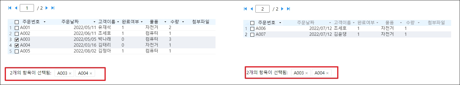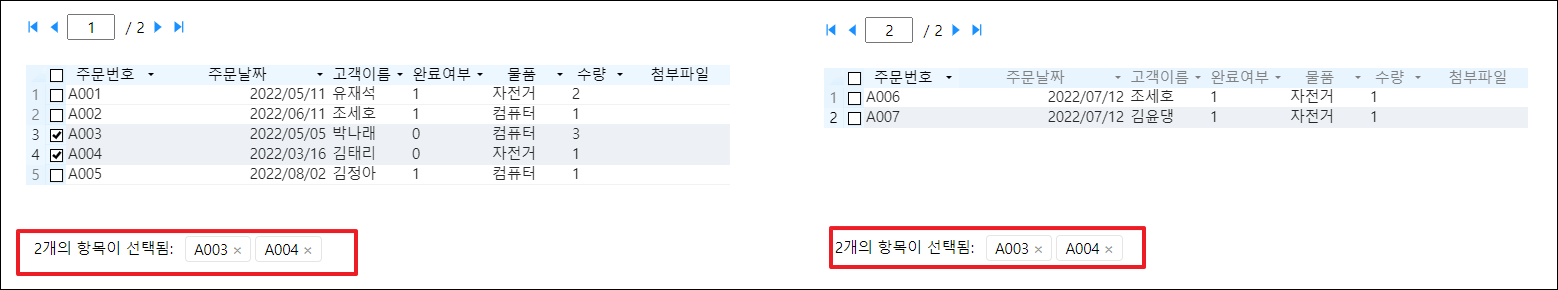 예를 들어 항상 선택 항목 유지를 선택하지 않으면 테이블이 페이징되고 첫 번째 페이지의 데이터를 선택한 다음 페이지를 넘기고 다음 페이지의 데이터를 선택하면 이전에 선택한 데이터가 유지되지 않습니다.