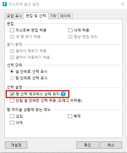 이 옵션을 선택하면 리스트뷰를 다시 로드할 때 리스트뷰의 선택이 유지됩니다. 리스트뷰 선택 항목기를 사용할 때 이 옵션을 선택하는 것이 좋습니다.