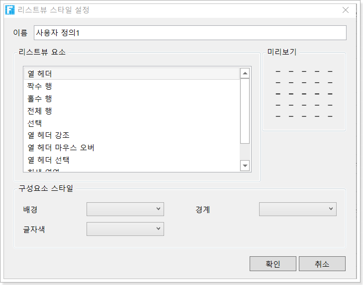 수정할 리스트뷰 스타일을 마우스 오른쪽 버튼 클릭하고 [수정]을 선택하고 팝업 [리스트뷰 스타일 설정] 대화 상자에서 리스트뷰 요소 스타일을 수정합니다.