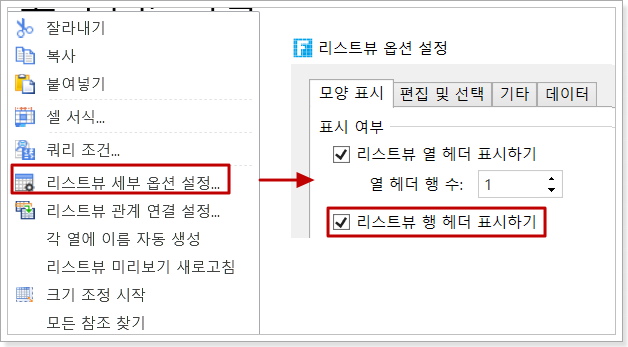방법 2. 리스트뷰를 선택하고 마우스 오른쪽 버튼을 클릭하고 마우스 오른쪽 버튼 클릭 메뉴에서 [리스트뷰 세부 옵션 설정]을 선택하고 리스트뷰옵션 설정 대화 상자를 표시하고 [리스트뷰 행 헤더 표시하기]를 선택합니다.
