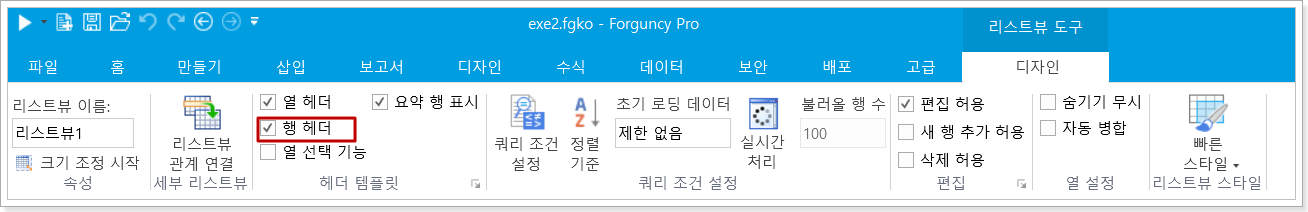 방법 1. 리스트뷰 선택한 후 리본의 [리스트뷰 도구-디자인-스타일 옵션] 영역에서 [행 헤더] 선택합니다.