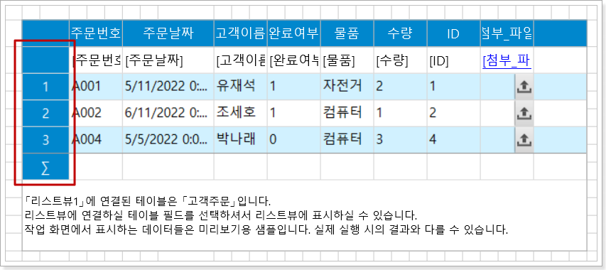 리스트뷰 템플릿 행의 첫 번째 셀이 비어 있으면 실행 후 리스트뷰의 행 헤더에 행 순번이 표시됩니다.