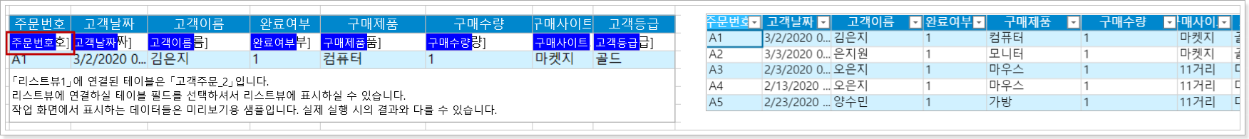 리스트뷰 템플릿 행의 첫 번째 셀이 비어 있지 않고 필드 또는 기타 고정 값이 있는 경우 실행 후 행 헤더에 필드 값 또는 고정 값이 표시됩니다.