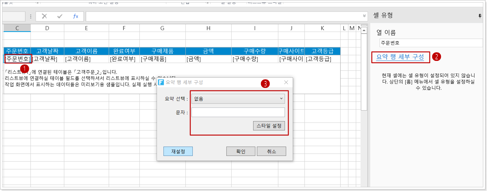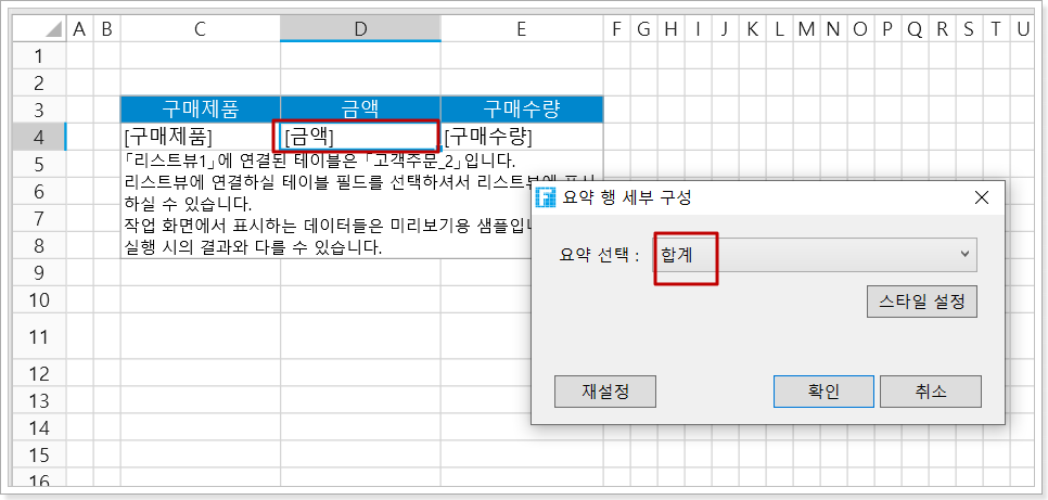 리스트뷰에서 열을 선택하고 셀 설정에서 [요약 행 세부 구성]을 클릭하면 요약 행을 설정하는 대화 상자가 나타납니다.