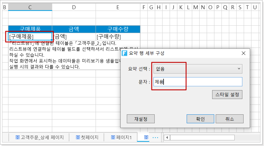 예를 들어 리스트뷰에서 구매제품 열과 금 열을 선택하고 요약 행의 수식 유형을 일반 텍스트로 설정하고 텍스트를 제품으로 설정합니다.