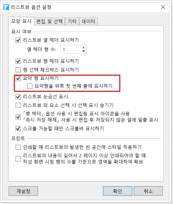 리스트뷰 설정의 모양 탭에서 요약 행을 선택하면 리스트뷰의 요약 행이 열립니다. 기본 요약 행은 리스트뷰 맨 아래에 있으며 "요약행을 위쪽 첫 번째 줄에 표시하기"를 선택하면 요약 행이 테이블의 맨 아래에 표시됩니다.