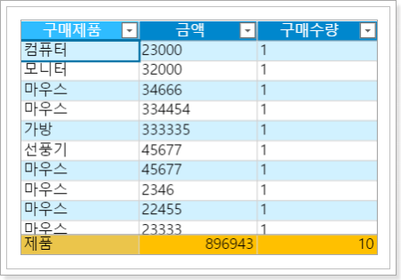 수량 및 금액 열을 선택하여 요약 행의 공식 유형을 합계로 설정합니다.