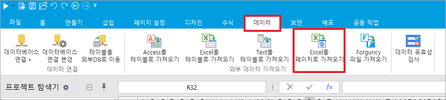 1. 리본 메뉴에서 \[데이터>Excel을 페이지로 가져오기]를 선택합니다.