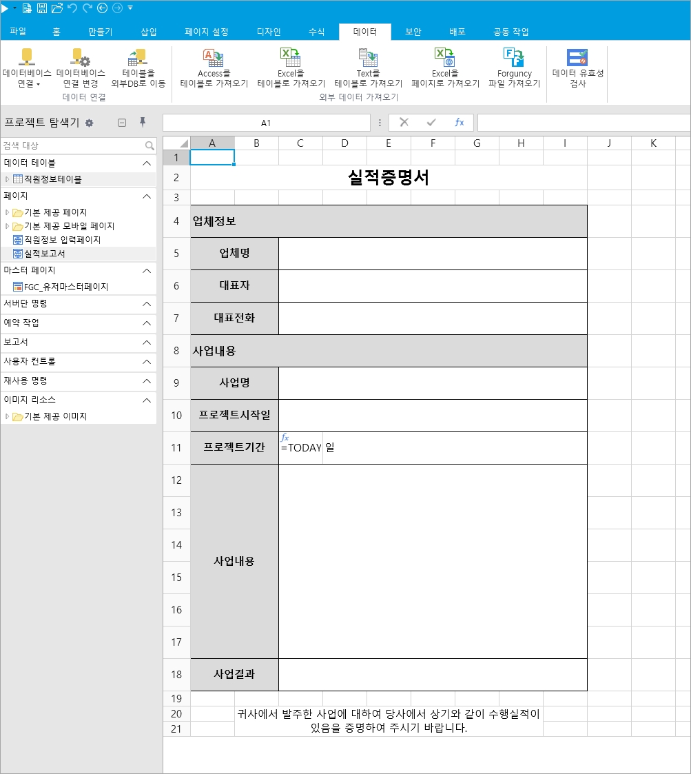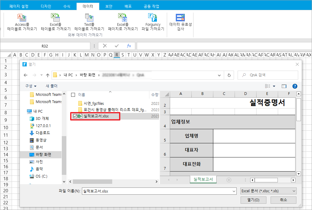 아래와 같은 방법으로 Excel파일을 포건시 페이지로 가져올 수 있습니다.