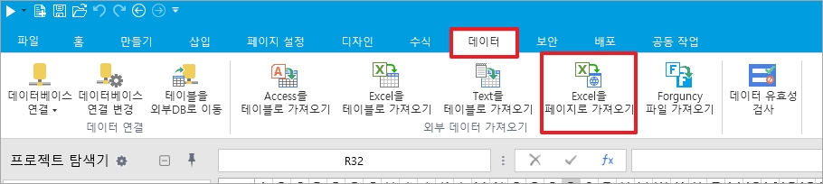 리본 메뉴에서 [데이터>Excel을 페이지로 가져오기]를 선택합니다.