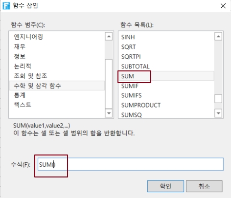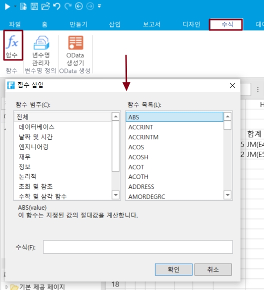 메뉴에서 [수식]>[함수] 선택