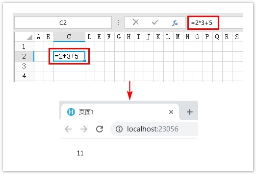 예를 들어 셀이나 수식 표시줄의 오른쪽에 있는 편집 필드에 수식 =2*3+5를 입력하고 2와 3을 곱한 다음 결과를 5에 더하여 실행한 후 답변 11을 얻습니다.