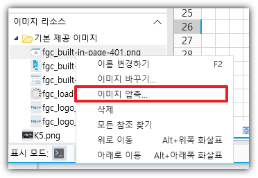 이미지 리소스를 선택하고 우클릭 후 우클릭 메뉴에서 "이미지 바꾸기"를 선택하여 파일매니저를 열어 이미지를 선택하면 원본 이미지가 교체됩니다.