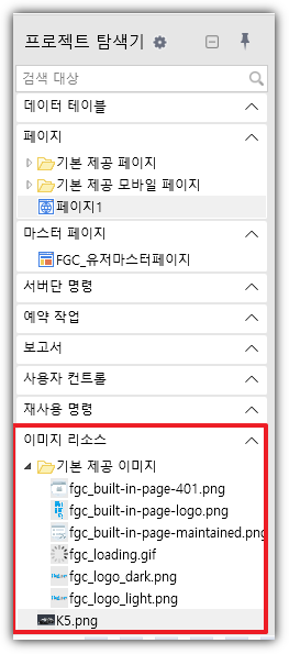 프로젝트 탐색기에서는 기본적으로 이미지 리소스가 표시되며, 업로드된 이미지 리소스를 일률적으로 관리할 수 있습니다. 이미지 리소스 위로 마우스를 이동하면 이미지 미리보기가 표시됩니다.