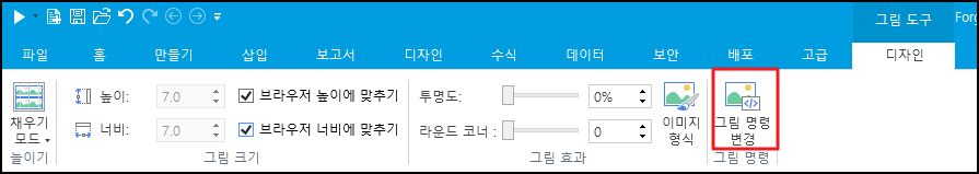 또는 배경 이미지를 선택하고 리본 메뉴 모음에서 그림 도구-디자인에서 그림 명령을 클릭합니다.