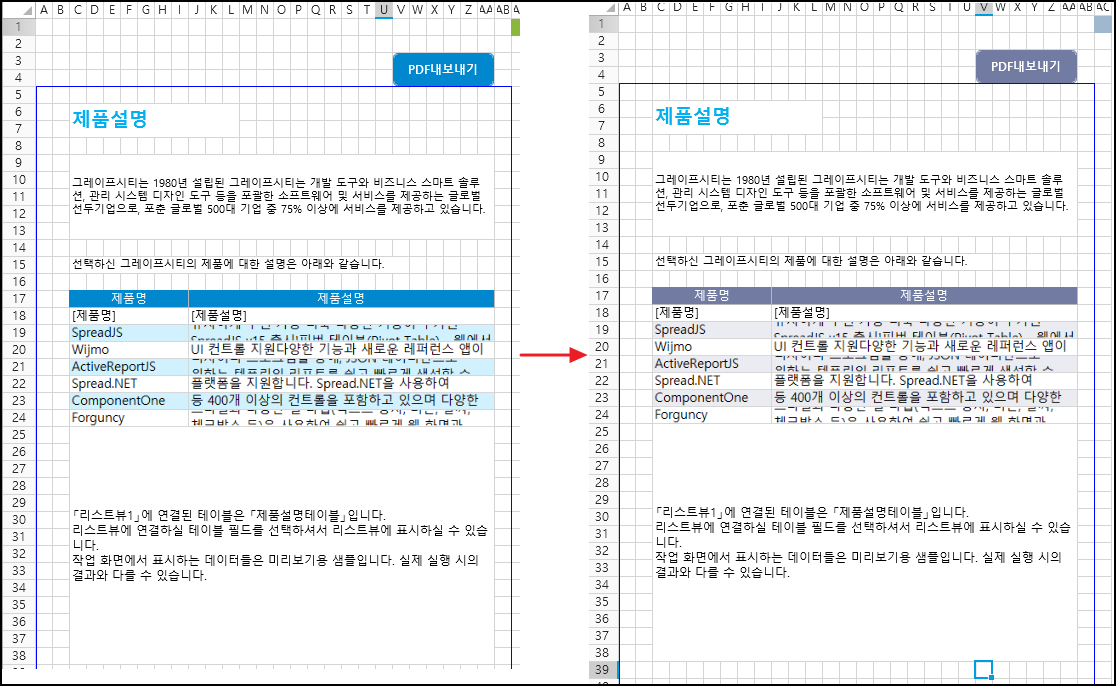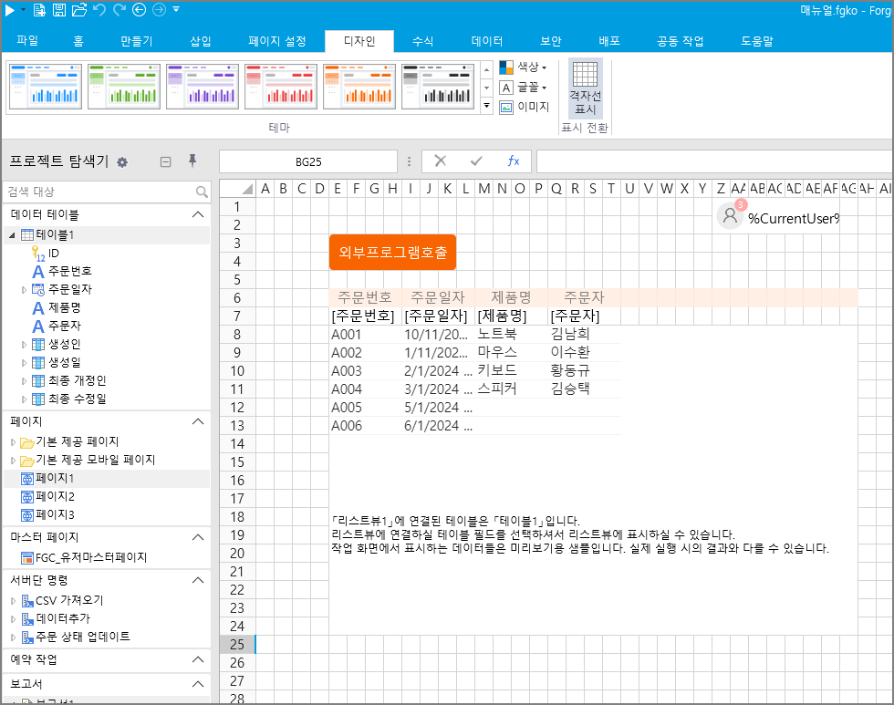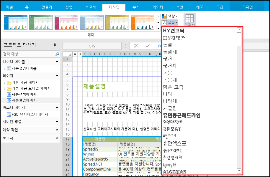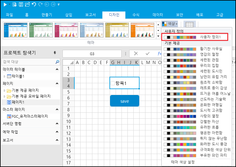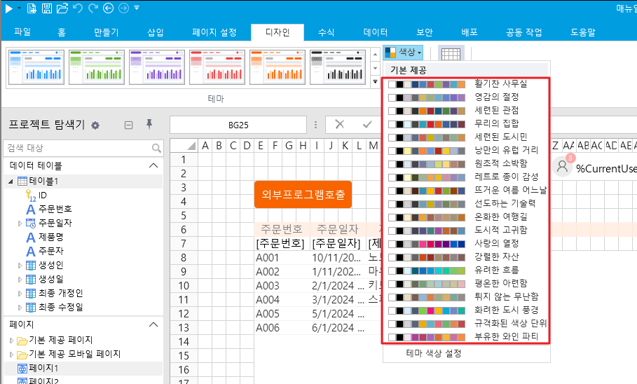예를 들어 디자이너에 기본 테마를 적용할 때 다음과 같이 표시됩니다.