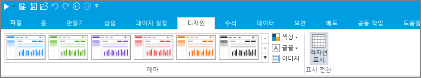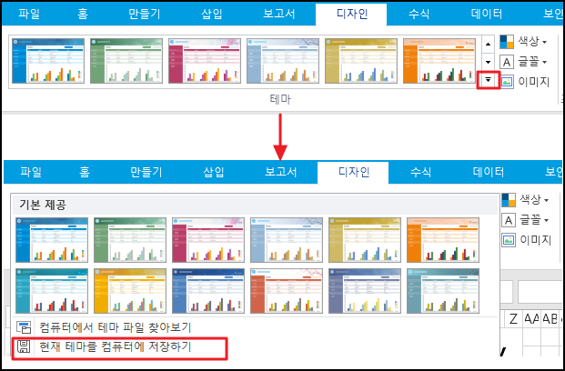 리본 메뉴 모음에서 [디자인]을 클릭하면 기본 테마가 첫 번째 테마인 테마를 선택하고 디자인할 수 있습니다.
