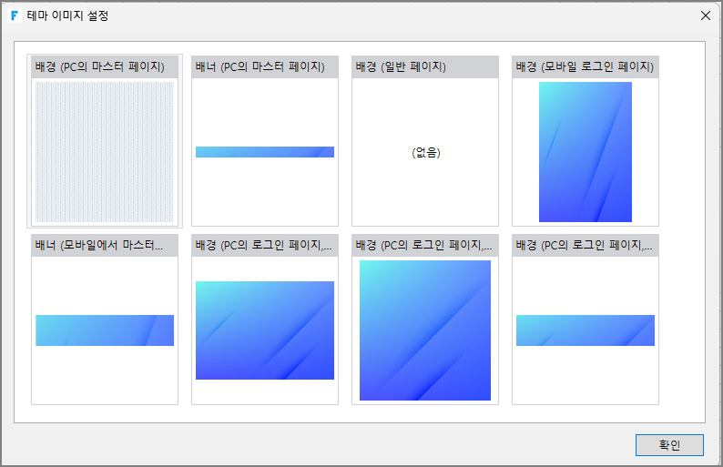 대화 상자에는 PC 마스터 페이지의 배경 이미지, PC 마스터 페이지의 열 차트, 일반 페이지의 배경 이미지, 휴대폰 로그인 페이지의 배경 보기, 휴대폰 마스터 페이지의 열 차트, PC 로그인 페이지의 세 가지 크기의 배경 맵 등 8가지 유형의 이미지가 포함되어 있습니다.