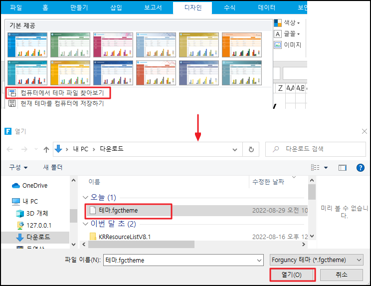 [컴퓨터에서 테마 파일 찾아보기]를 클릭하고 테마가 있는 폴더를 선택한 다음 접미사 이름이 [.fgctheme]인 파일을 선택한 다음 [열기]를 클릭합니다.