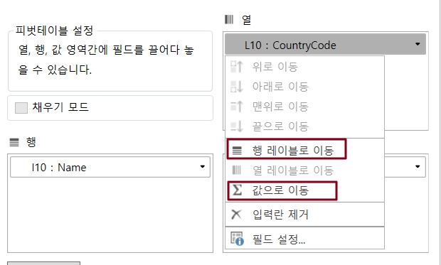 영역 간의 필드는 서로 이동할 수 있으며, 한 필드를 직접 선택하여 다른 영역으로 이동하거나 필드 오른쪽에 있는 드롭다운 메뉴를 클릭하고 선택을 클릭하여 다른 두 영역으로 이동할 수 있습니다.
