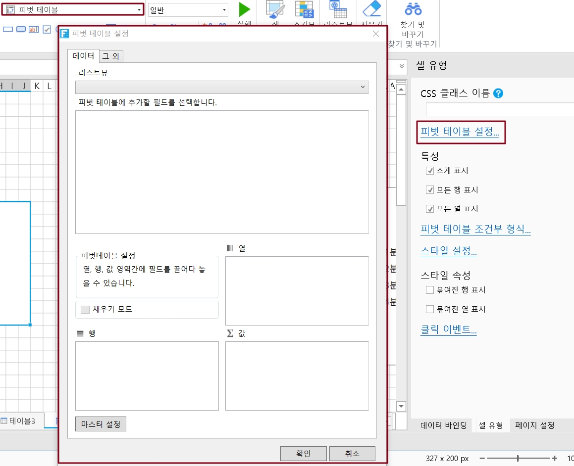 셀 설정에서 [피벗 테이블 설정]을 클릭하여 피벗 테이블 설정 대화 상자를 표시합니다.