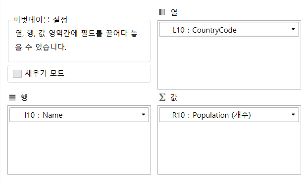 필드와 연결된 값 및 숫자 형식은 행 및 열 영역의 필드 설정에서 설정할 수 있습니다.