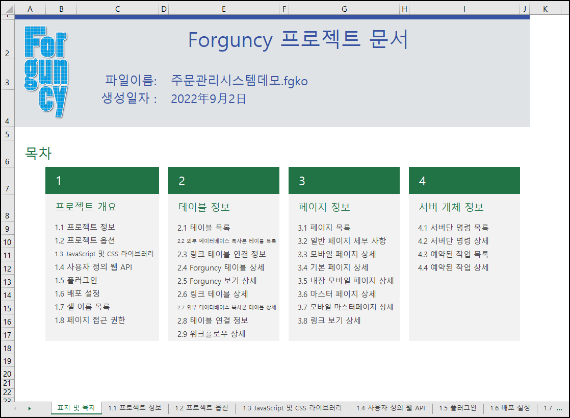 | 표지 및 카탈로그                | 파일 이름, 생성 날짜 및 디렉터리를 포함한 프로젝트 개요를 소개합니다.                                                                                                                                                                                                                                                                                                                                                  |