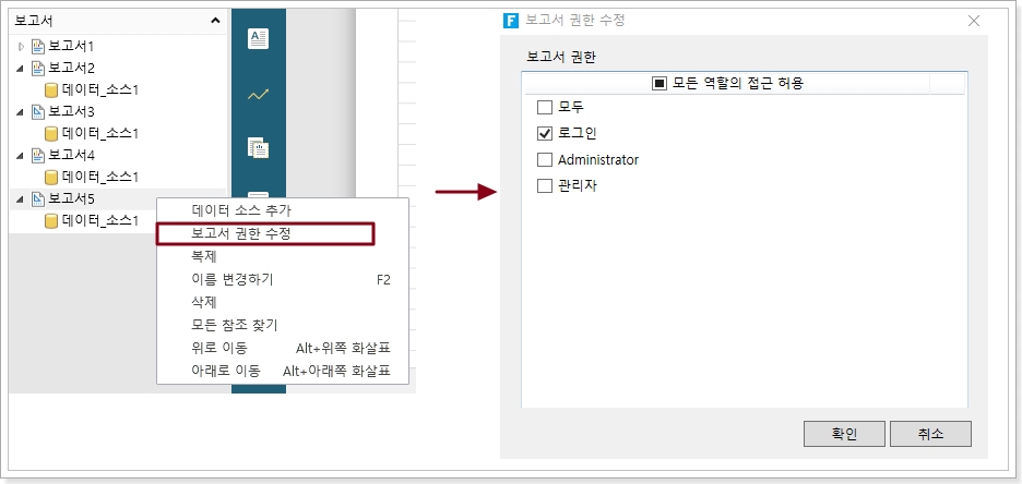 보고서 권한을 편집합니다. 보고서를 선택하고 마우스 오른쪽 버튼을 클릭한 다음 오른쪽 메뉴에서 보고서 권한 편집을 선택합니다. 팝업 대화 상자에서 보고서를 보고 내보낼 수 있는 역할을 선택합니다.