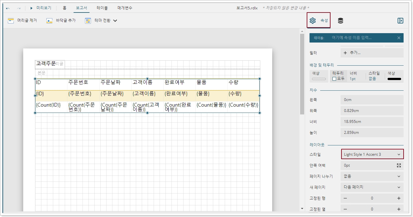 테이블을 보고서 본문 영역으로 드래그합니다.