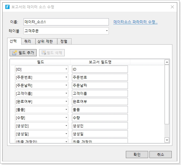 데이터 소스 파라미터 편집: 추가된 데이터 소스 파라미터는 쿼리 조건, 쿼리 행 수 등에서 사용할 수 있습니다.