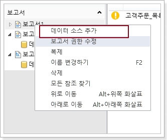 데이터 원본을 만듭니다. 보고서를 선택하고 마우스 오른쪽 버튼을 클릭한 다음 마우스 오른쪽 버튼 클릭 메뉴에서 데이터 소스 추가를 선택하여 보고서 데이터 원본 편집 대화 상자를 표시합니다.