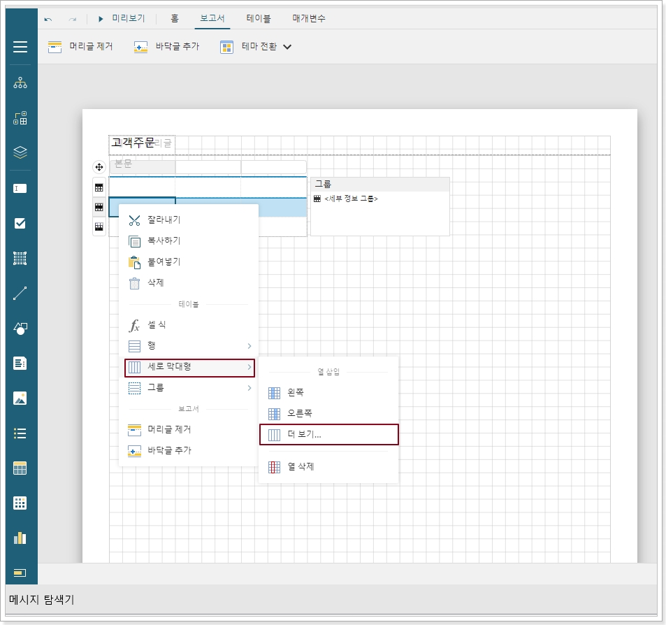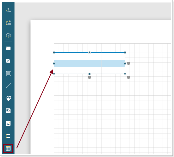 보고서 디자이너의 도구 상자에서 테이블 구성 요소를 선택하고 드래그하거나 탭하여 디자인 영역에 추가합니다.