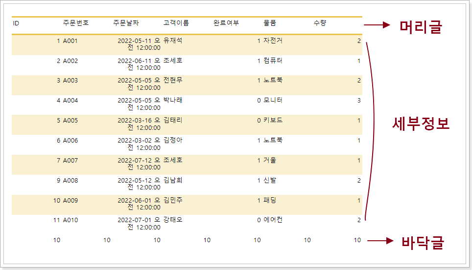 이 세 가지 기능 영역은 데이터를 바인딩한 후 테이블의 머리글,세부정보,바닥글 생성합니다.