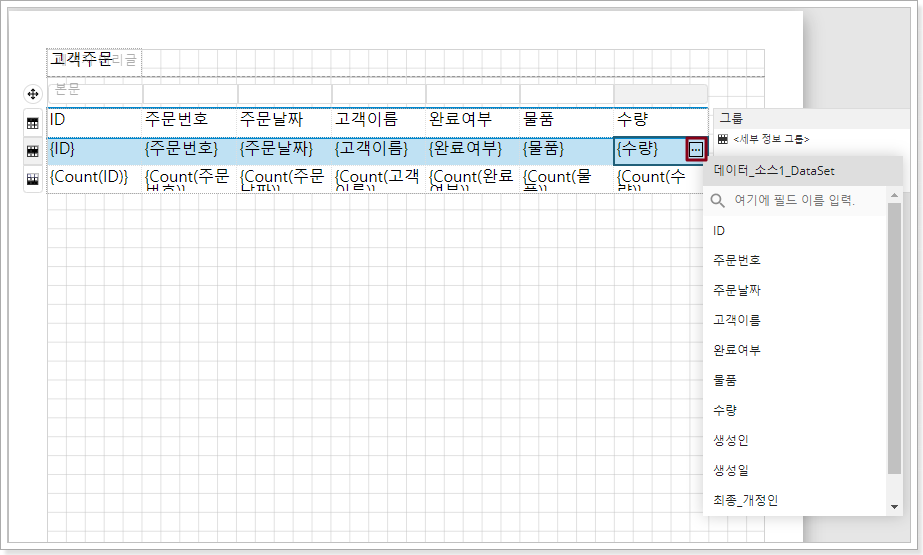 테이블 세부 정보 영역의 셀에서 오른쪽에 있는 작은 사각형 버튼 클릭하고 드롭다운 목록에서 데이터 집합의 필드를 선택하여 데이터 바인딩을 완료합니다.