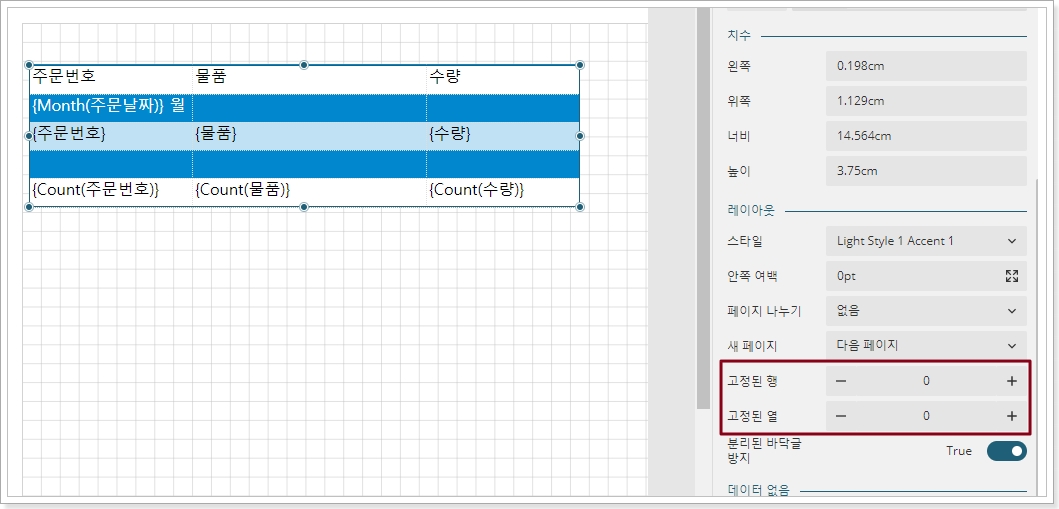 미리 볼 때 고정된 행이나 열이 스크롤 막대와 함께 스크롤되지 않도록 행과 행을 고정하는 기능을 보고서에 제공합니다.