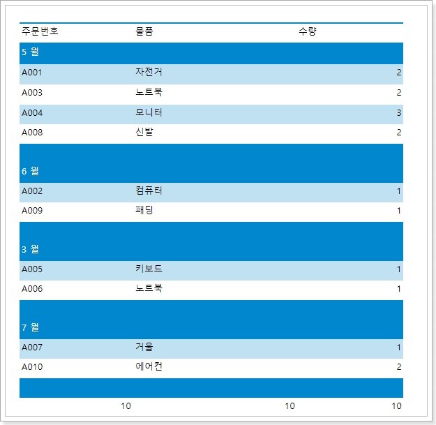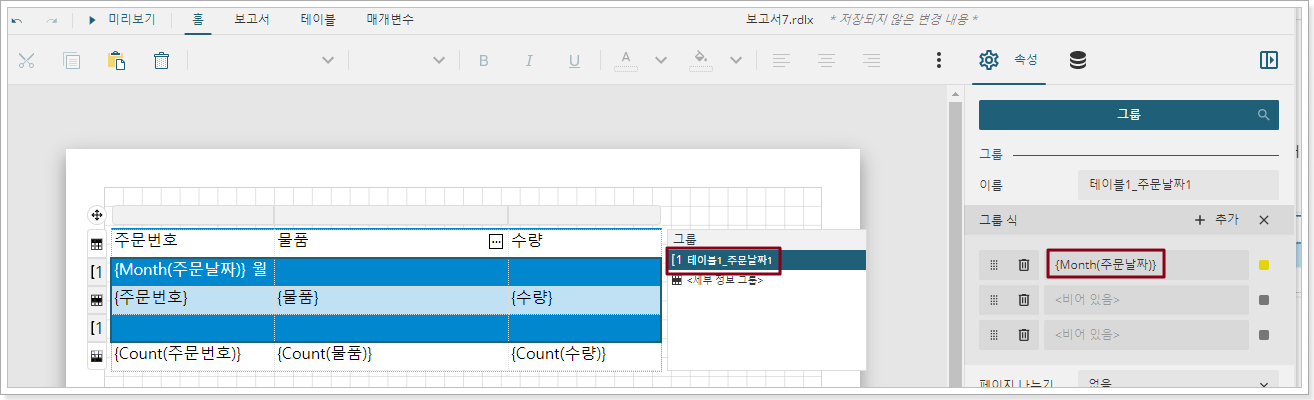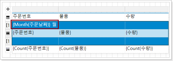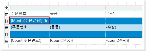 그룹 헤더 셀 표현식을 "{Month(주문 일자)}월"로 조정하여 그룹 헤더가 "1월, 2월, 3월"로 표시되도록 합니다.