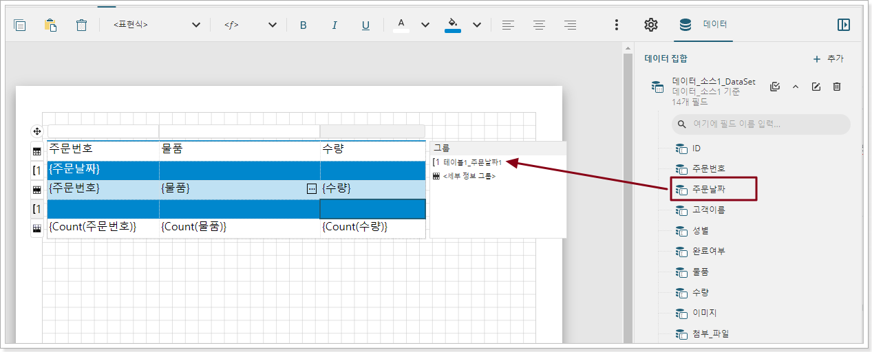 테이블의 셀을 클릭하여 테이블에 테이블 그룹화 창이 표시되도록 한 다음 주문 날짜를 테이블 그룹화 창으로 드래그하면 테이블에 그룹화가 나타납니다.