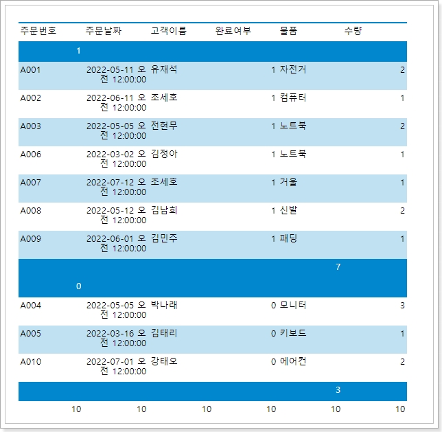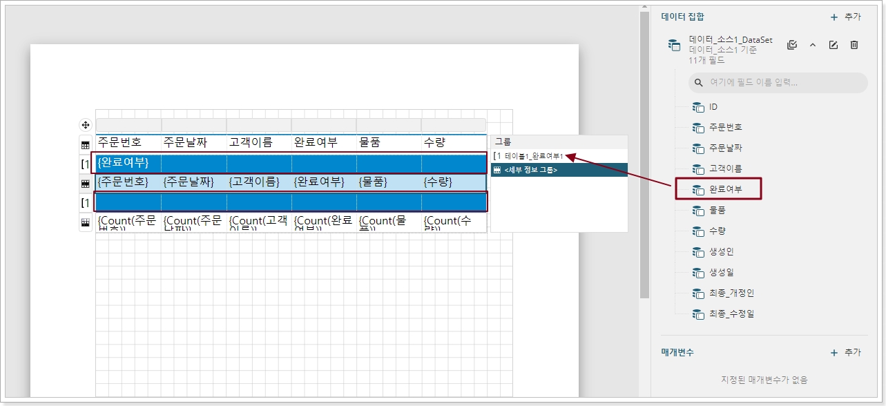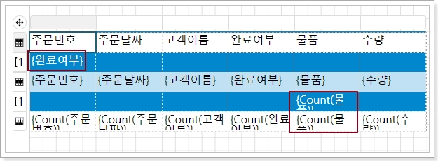 데이터를 바인딩합니다. 그룹 머리글에 그룹화 필드 "완료여부" 자동으로 표시됩니다. 그런 다음 그룹화된 꼬리와 끝이 주문 번호 필드에 바인딩됩니다(계산이 자동으로 수행됨). 읽기 쉽도록 표의 꼬리에 있는 다른 항목은 예제에서 제거됩니다.